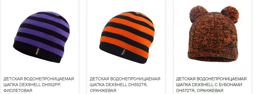 В ассортимент Dexshell входит ряд моделей шапок для осенне-зимнего сезона. Они отличаются составом ткани и дизайном, но имеют одну схожую деталь — наличие в составе уникальной мембраны Porelle, которая является ключевым элементом в изделиях бренда, включая не только взрослую, но и детскую одежду Dexshell.