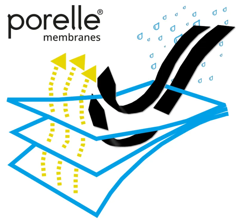 - Средний слой: дышащая мембрана Porelle. Это основа всех изделий бренда, наделяющая их главным свойством – способностью отталкивать влагу, которая попадает на верхний слой.